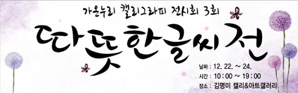 캘리그라피 전시회안내 [따뜻한글씨전] 페이지 정보 작성자 최고관리자 작성일18-01-02 17:19 조회7,569회 댓글0건 관련링크 이전글 다음글 목록 본문 캘리그라피 전시회안내[따뜻한글씨전] 가온누리3회 캘리그라피전시회 따뜻한글씨전캘리그라퍼김명미.류성희.박채희.노복현.김경숙.김형숙.서연화.문체연문화예술평생교육진흥회POP글씨연구회 진주경남지부에서 캘리그라피강사님들이 캘리그라피전시회를 합니다.관심있는 분들 많이 보러 오세요. 장소: 진주시 남강로659번길 16 동성동,3층 김명미 캘리&아트갤러리날짜:2017년12월22일~24일관람시간:오전10시~오후7시 댓글목록 등록된 댓글이 없습니다. 이전글 다음글 목록